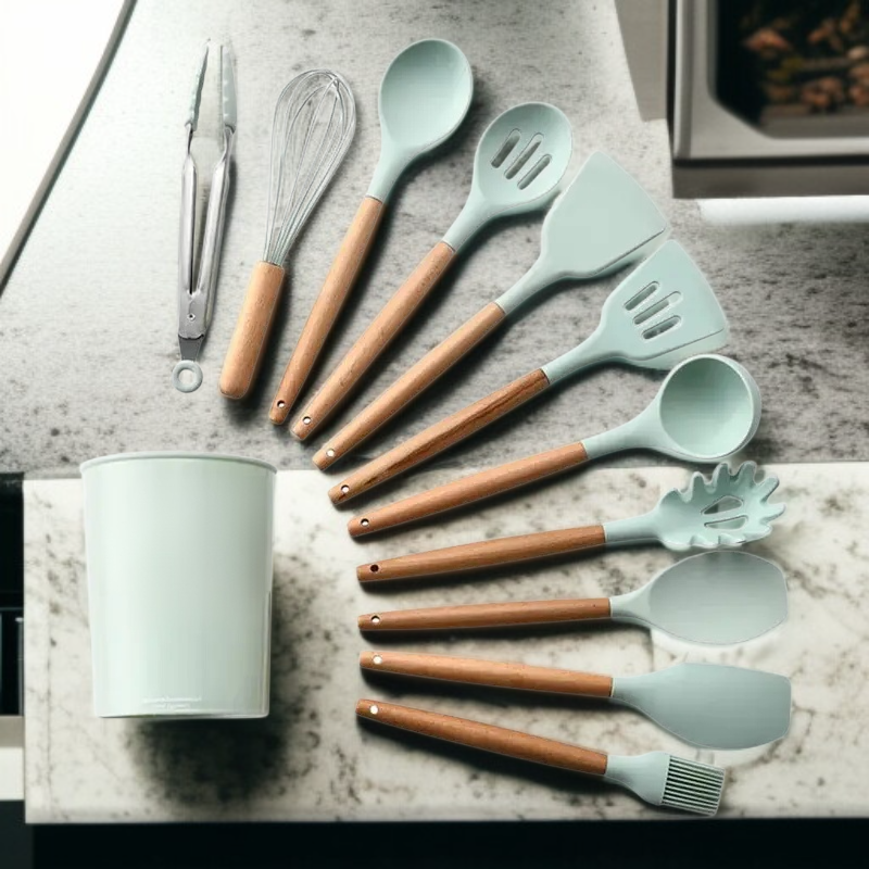 실리콘 조리도구 세트 연두색 논스틱 냄비 조리 주걱 나무 손잡이 주방 용품 세트